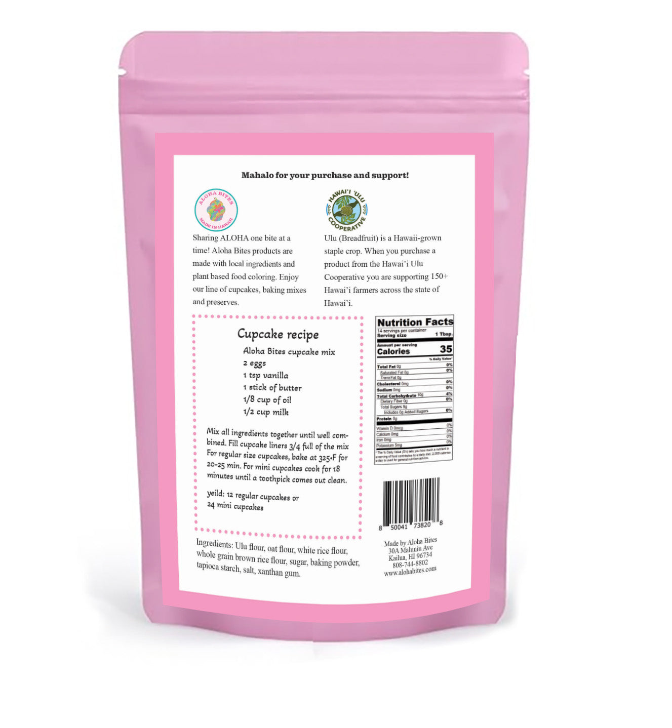 Our cupcake mix is a blend of ʻUlu flour with other gluten free, non-GMO, vegan flours. This mix makes a dozen regular size cupcakes or 24 mini cupcakes.