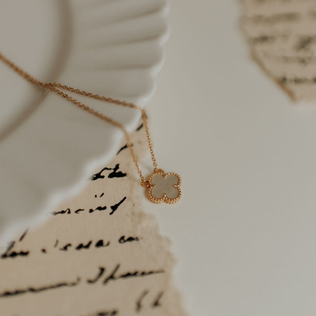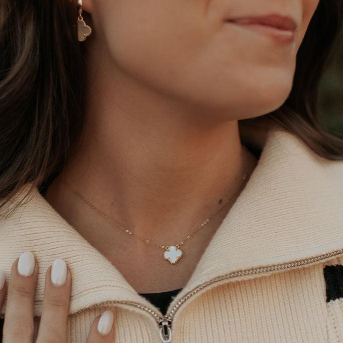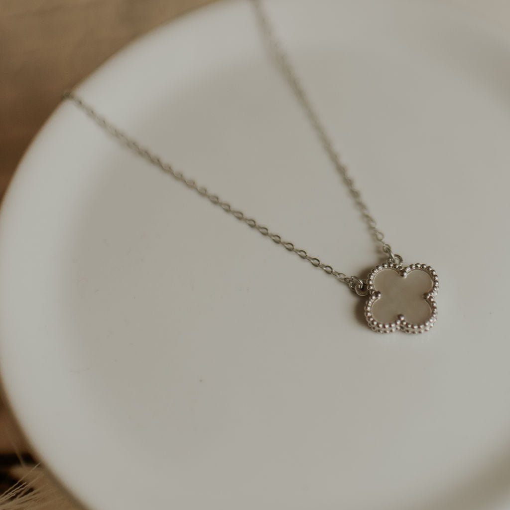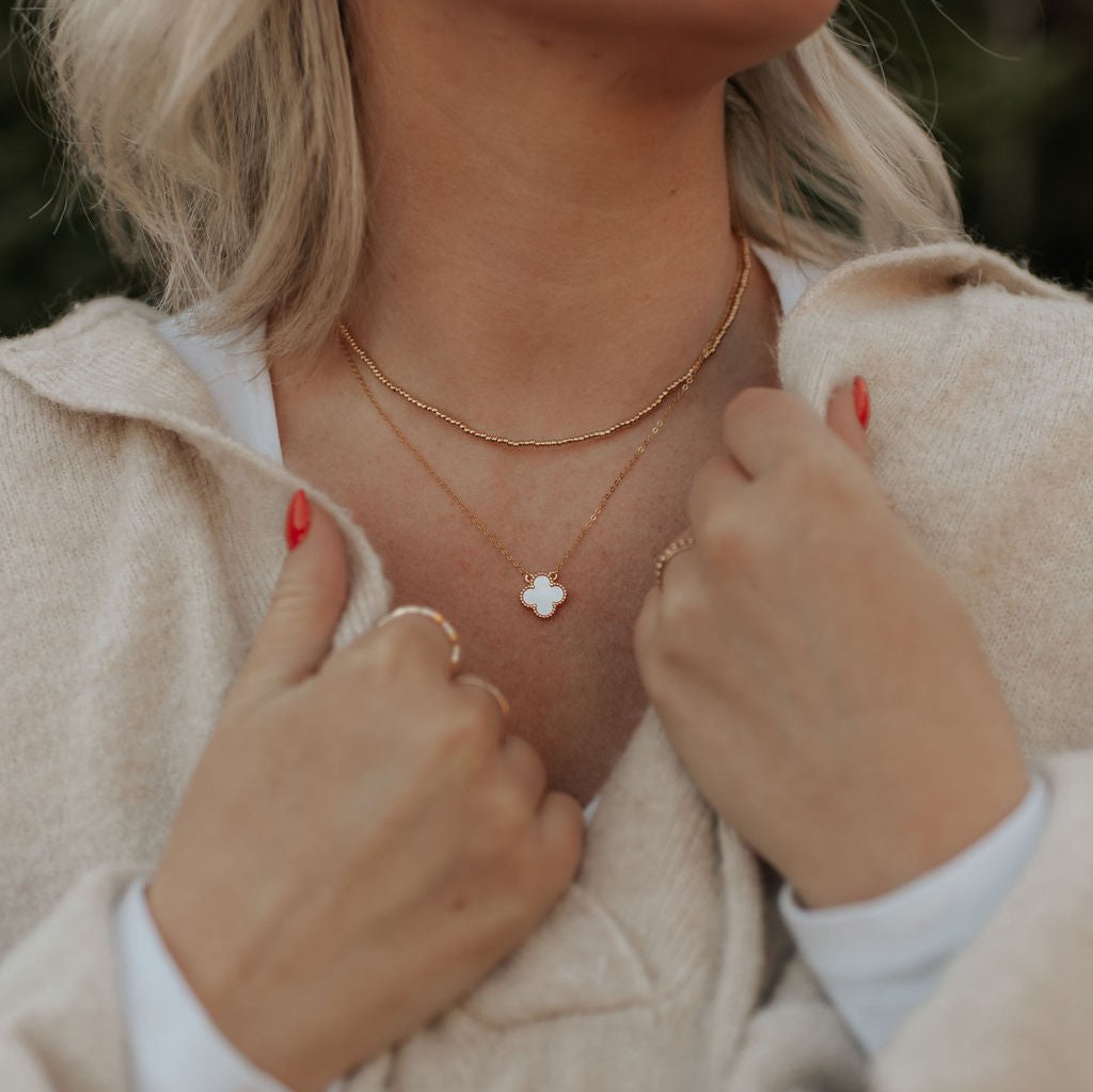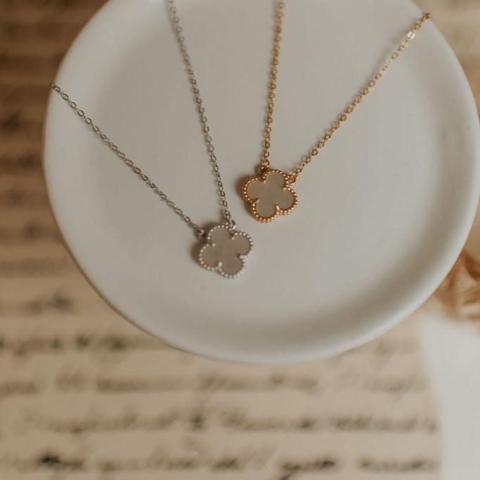 The Elizabeth Clover Necklace is the perfect elegant accessory for any outfit! Dainty mother of pearl double sided clover charm on a 15.5" with an extender to 17.5". Made with .925 sterling silver metal and gold vermeil, hypoallergenic, and lead and nickel free.