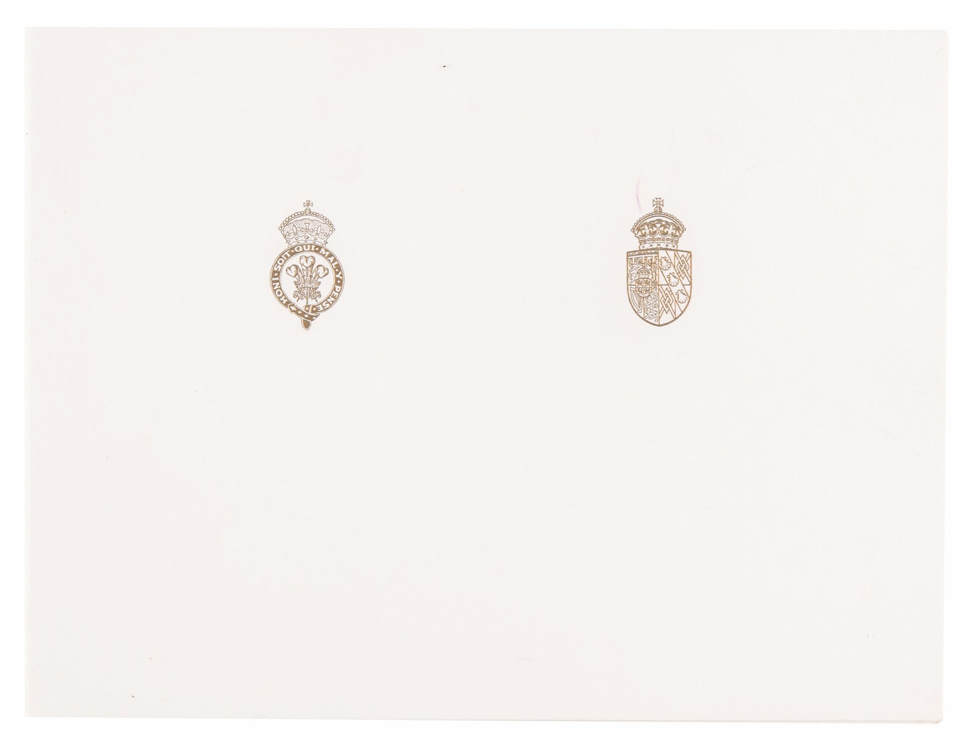 Elegantly embossed with Prince of Wale's feathers, the Order of the Garter moot, and the Spencer family arms, this rare holiday collectible opens to a wide 16 x 6 inches, with the original affixed photograph and handwritten inscription in fountain pen reading: "Mr. & Mrs. Maxwell, from Diana and Charles."
